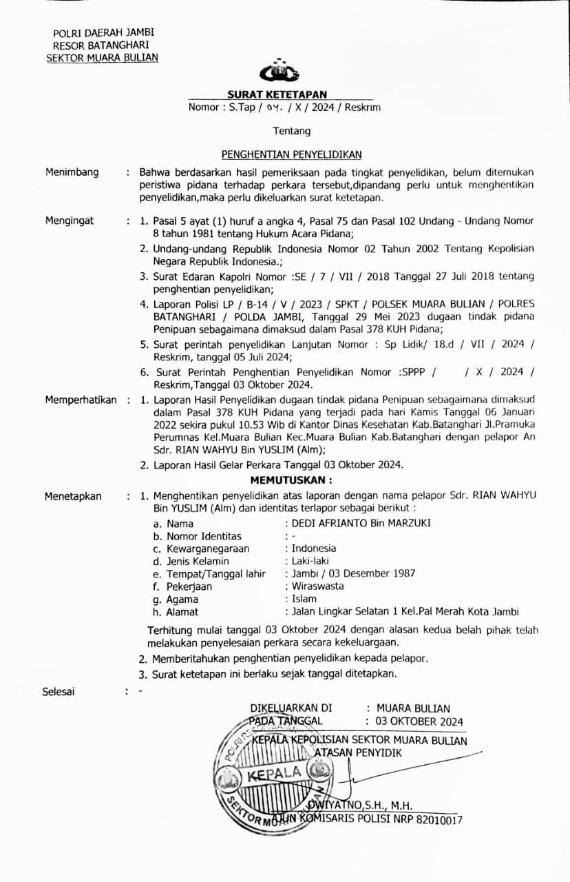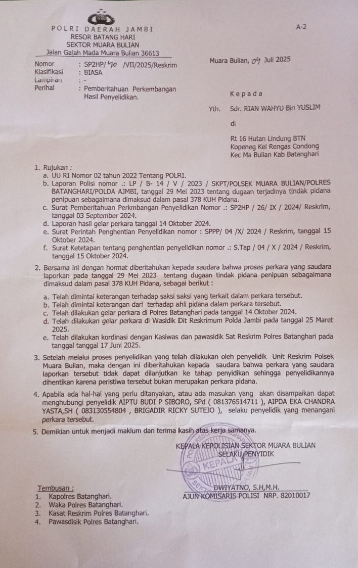 Pada 17 April 2025, Polsek Muara Bulian kembali menjelaskan bahwa kasus dihentikan karena “bukan peristiwa pidana”, berdasarkan gelar perkara di Wassidik Ditreskrimum Polda Jambi. Tak berhenti di situ, pada 7 Juli 2025, korban menerima SP2HP lagi dari Polsek Muara Bulian, yang juga menyatakan penghentian penyelidikan karena “bukan peristiwa pidana”, kali ini merujuk pada gelar perkara di Polres Batang Hari pada 14 Oktober 2024 dengan Surat Ketetapan No. S. Tap / 04 / X / 2024 / Reskrim tanggal 15 Oktober 2024.