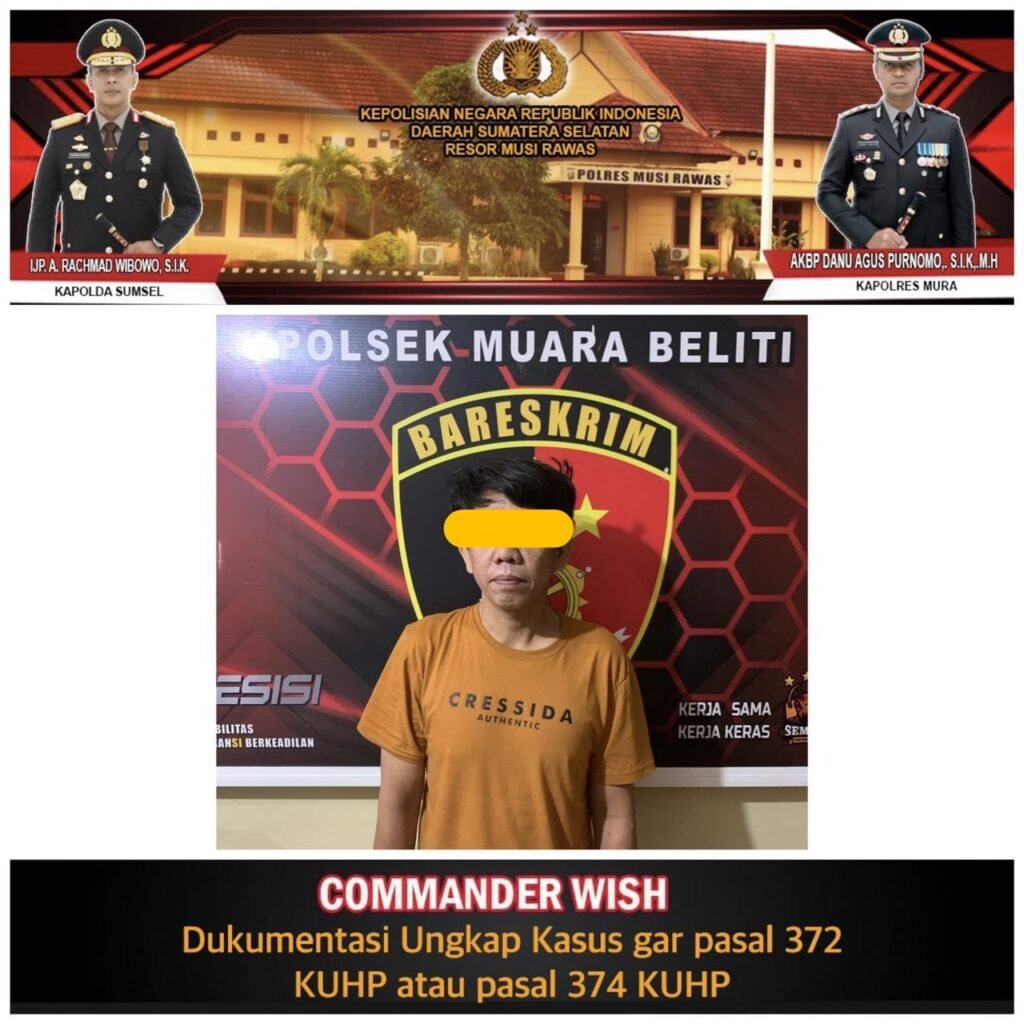 Akhirnya tersangka yang beralamat di Perumnas Griya Air Temam Blok J 1 No. 01, Kecamatab Lubuklinggau Selatan II, Kota Lubuklinggau, dibekuk anggota Polsek Muara Beliti, dijalan hendak melintas mengendarai motor di Keretapati, Kota Palembang, Provinsi Sumsel, sekitar pukul 18.10 WIB, Minggu (10/9/2023).