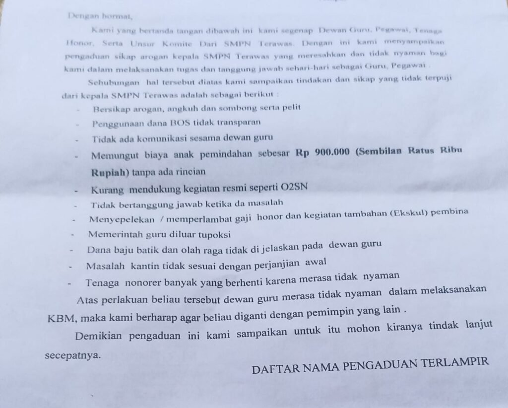 Isi surat pengaduan yang di lakukan Dewan Guru dan Pegawai SMP Negeri Terawas yang di koordinir oleh salah satu guru yang mengajar di SMP Negeri Terawas inisial Z.