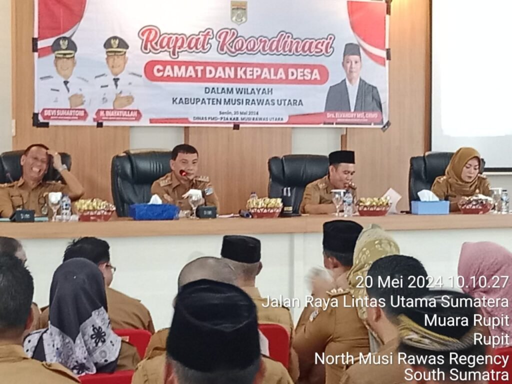 Muratara, mitrakeadilan.com – Bupati Musi Rawas Utara (Muratara) H. Devi Suhartoni memimpin rapat koordinasi (Rakor) dengan kepala desa (Kades) se Kabupaten Muratara.