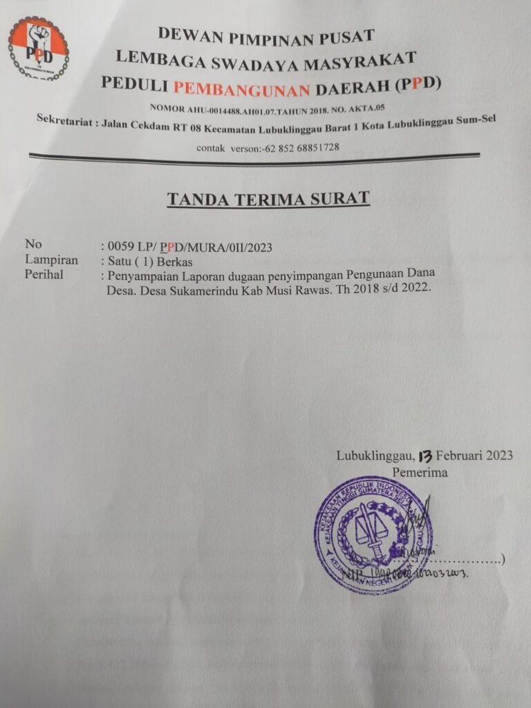 Lubuklinggau, 13 februari 2022 Lembaga Swadaya Masyarakat Peduli Pembangunan Daerah (LSM-PPD) menyampaikan laporan atas dugaan penyimpangan Penggunaan Dana Desa (DD) Tahun Anggaran 2018 hingga 2022 ke Kejaksaan Negeri (Kajari) Kota Lubuklinggau, Provinsi Sumatera Selatan, Diduga ladang bancakan.