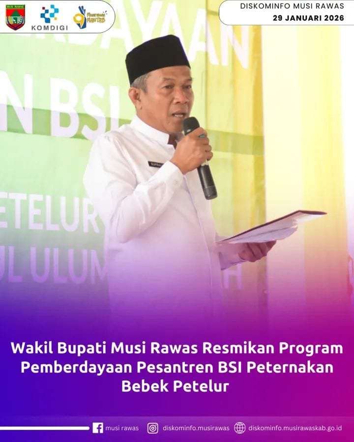 Wakil Bupati Musi Rawas, H. Suprayitno, menghadiri sekaligus meresmikan kegiatan Peresmian dan Tasyakuran Program Pemberdayaan Pesantren Bank Syariah Indonesia (BSI) melalui Usaha Peternakan Bebek Petelur, yang dilaksanakan di Kompleks Pondok Pesantren Darul Ulum Al-Fatah, Desa E Wonokerto, Kecamatan Tugumulyo, Kamis (29/01/2026).