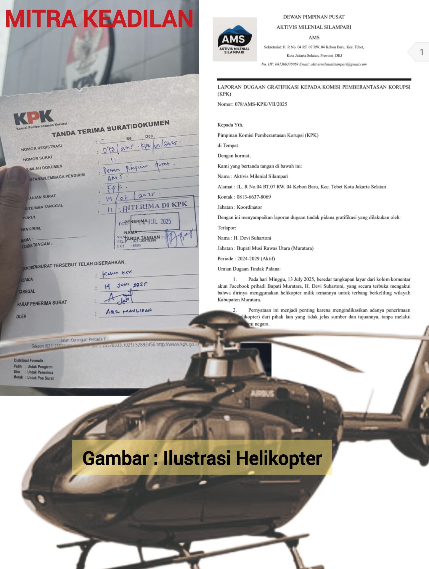 Aktivis Milenial Silampari, Aqil Maulidan, secara resmi melaporkan Bupati Musi Rawas Utara (Muratara), H. Devi Suhartoni, ke Komisi Pemberantasan Korupsi (KPK) terkait dugaan gratifikasi penerimaan fasilitas berupa helikopter yang dipakainya untuk keperluan pribadi.