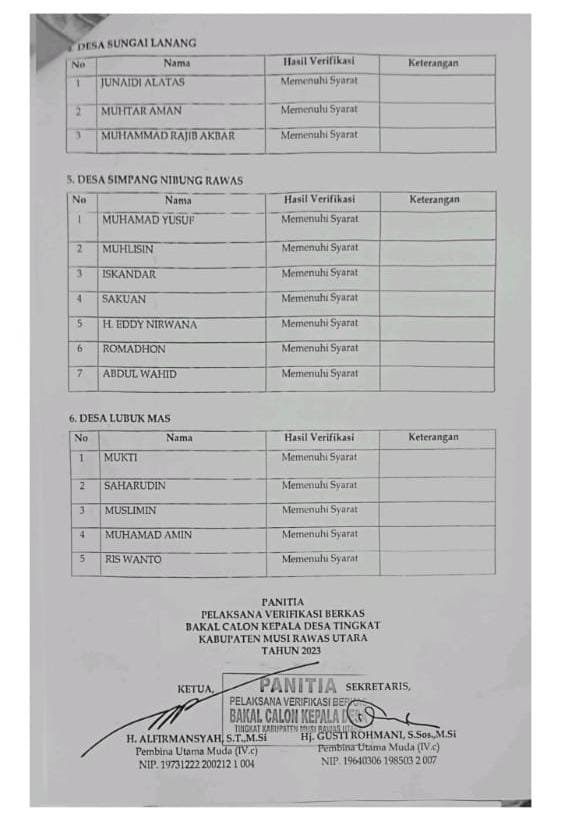 Berdasarkan hasil Verifikasi berkas bakal calon kepala Desa oleh panitia tingkat Kabupaten Musi Rawas Utara. Nomor 141/05/BA/FB-BCKD/VIII/2023 tertanggal ( 28/8/2023) pada Desa Pangkalan dinyatakan hanya satu orang yang memenuhi Syarat