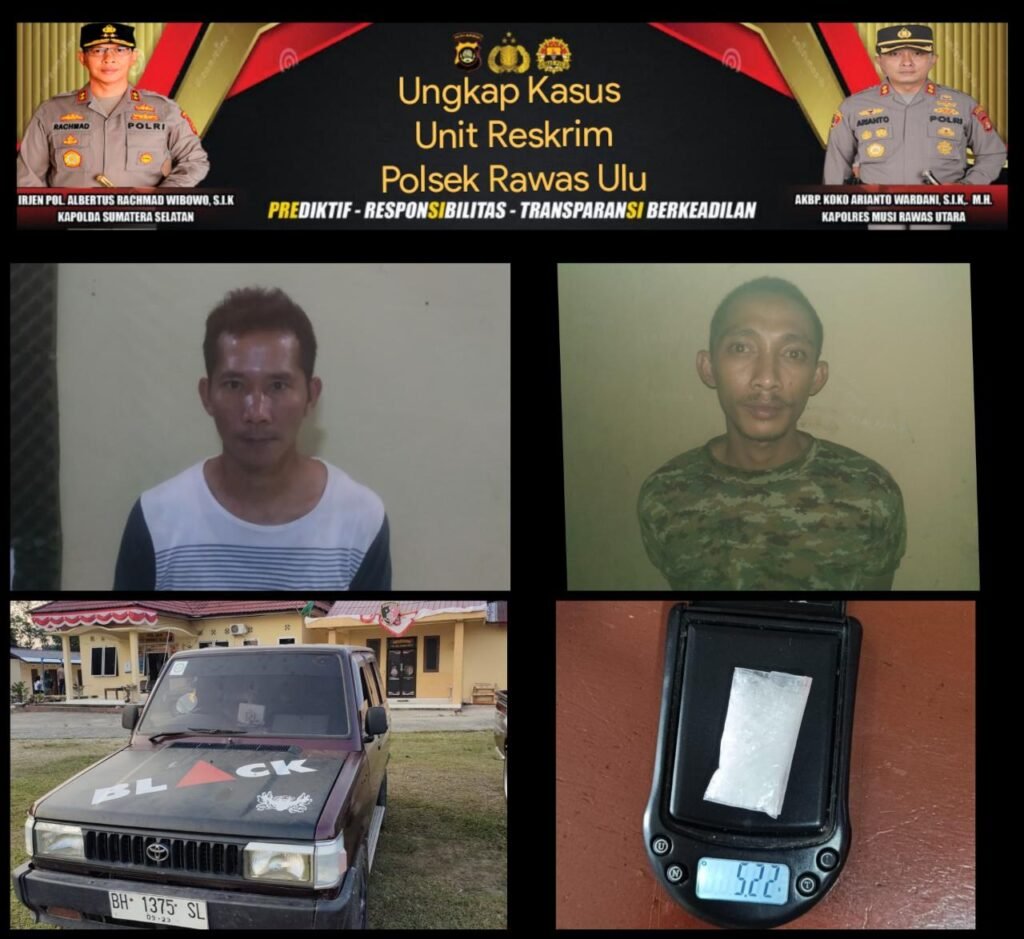 Dalam pemeriksaan anggota Polsek Rawas Ulu dipimpin Kanit Reskrim, ditemukan bukti kuat bahwa kedua pelaku memang benar membawa Narkoba jenis sabu. Barang bukti (BB) berupa Narkoba jenis Sabu seberat 5,22 (Lima Koma Dua Puluh Dua) Gram.