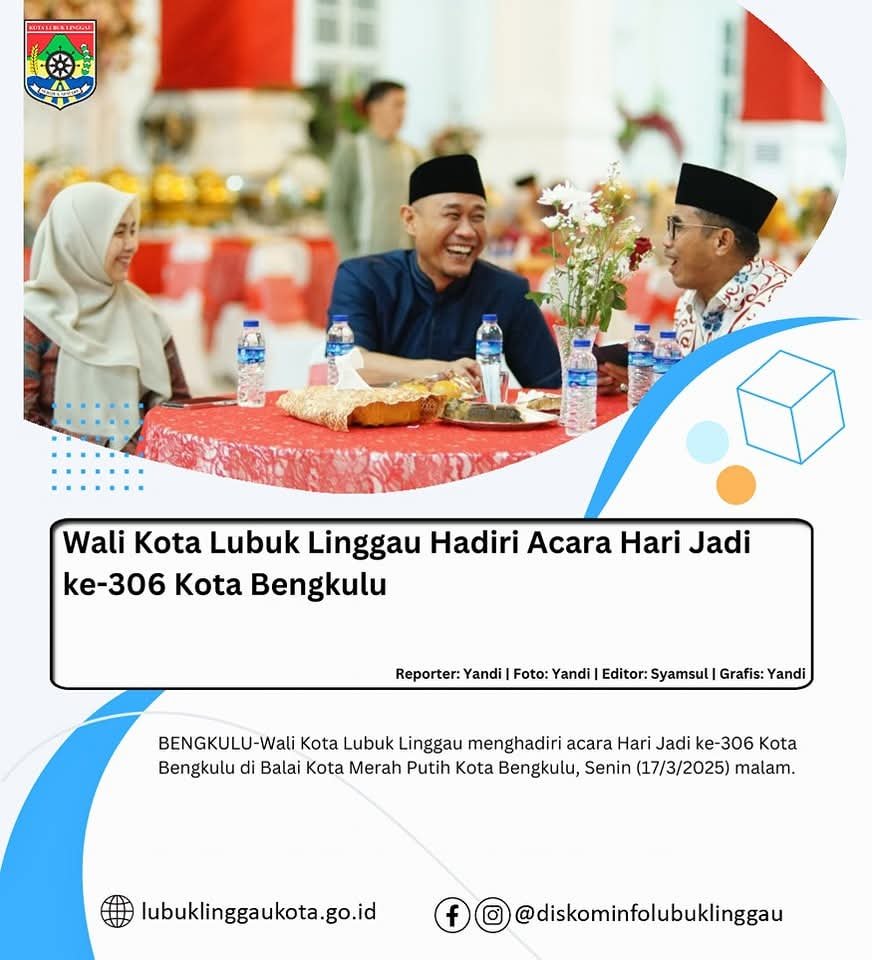 Lubuklinggau,-mitrakeadilan.com. Wali Kota Lubuk Linggau menghadiri acara Hari Jadi ke-306 Kota Bengkulu di Balai Kota Merah Putih Kota Bengkulu, Senin (17/3/2025) malam.